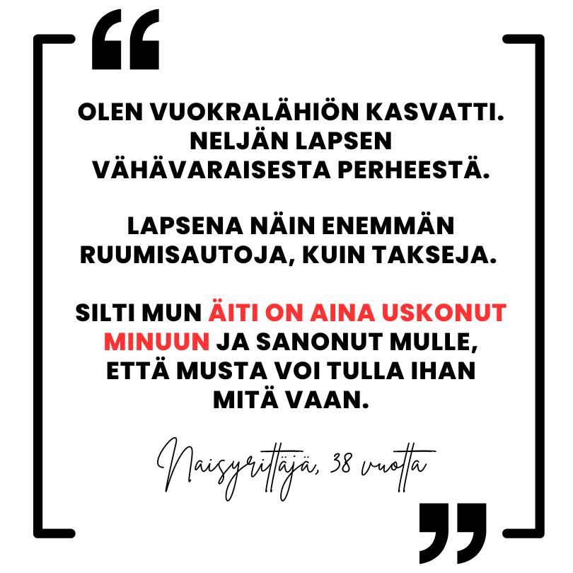 ”Tää elämä on niinku elämistä varten, että sun pitää niinku elää nyt ja tehdä niitä asioita NYT. Ethän sä edes tiedä, että oletko sä täällä vuoden päästä tekemässä niitä juttuja enää. Pitää elää, eikä pelätä". - Naisyrittäjä, 46 v
