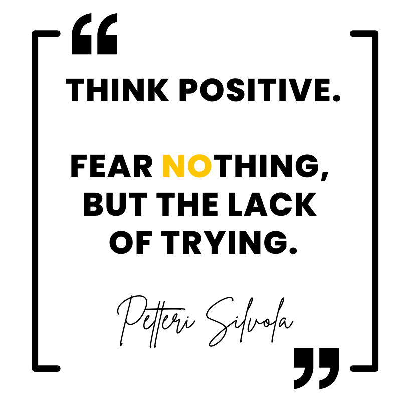 Kaikki myös epäonnistuvat joskus vaikkapa työpaikkahaastattelussa, opiskeluissa, ihmissuhteissa, urheilussa, työpaikalla tai yrittäjänä. On tärkeää yrittää uudelleen ja jatkaa positiivisesti eteenpäin, vaikka kokee häviön ja tappion hetkiä - vastoinkäymisiä. Legendaarinen 1995 lätkäjoukkueen maailmanmestari ja kapteeni Timo Jutilakin sanoo aina "menevänsä eteenpäin".